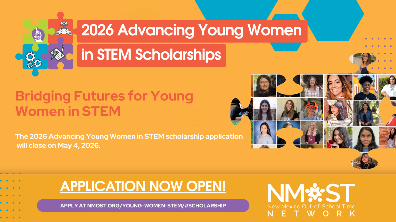 Women remain underrepresented in the Science, Technology, Engineering, and Math (STEM) professions, and young women often have fewer STEM opportunities and less access to them. As a way to help address gender inequity in STEM, the New Mexico Out-of-School Time Network (NMOST) has created the Advancing Young Women in STEM Scholarships. NMOST’s goal is to give women interested in STEM the opportunity to pursue their passions and interests and work towards closing the gender gap in STEM.